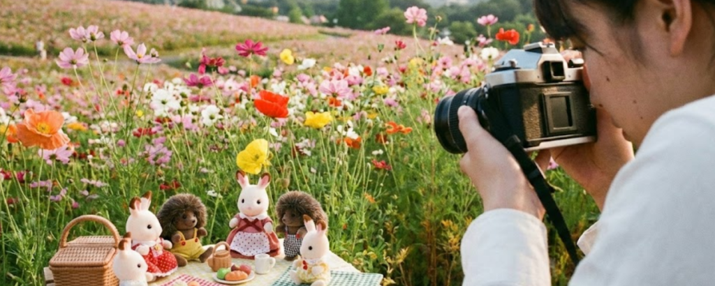 ハーベストの丘は季節の花(コスモス、ひまわり、チューリップ)が有名です。一面の花畑を背景に、持参したシルバニアを掲げて撮る「ぬい撮り」は、ここに来たら絶対にやるべきです。